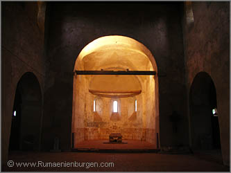Nachdem wir unser Auto abgestellt und gerade den Berg hinauf steigen wollten, fragte uns eine Frau auf Deutsch, ob wir die Kirche besichtigten wollten. Nachdem wir dies bejahten, teilte sie uns freundlich mit, dass die Besichtigung kostenpflichtig sei. Nachdem wir bezahlt hatten, gab sie uns den Schlüssel für das Tor. Oben angekommen merkte ich doch deutlich die Anstrengung der letzten Tage in meinen Beinen. Nichts desto trotz kämpfte ich mich nach der Innenbesichtigung auch noch durch das Gestrüpp auf die Rückseite der Wehrmauer, um die Ruinen der ehemaligen Toranlage auch von außen zu fotografieren (heutzutage gelangt man über ein ursprüngliches kleines Seitentor in die Ruine).