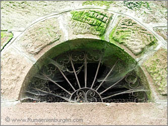 Nachdem ich mir die Kirchenburg in Maierus (Nussbach) angesehen hatte (wo ich eine halbe Ewigkeit an einem Bahnübergang wartete), war Belin (Blumendorf / Blumenau) mein nächstes Ziel, von dessen Kirchenburg ich über GoogeEarth (earth.google.de) Satellitenfotos erhalten hatte. Die Wehranlage selbst war leider verschlossen und aufgrund des Regens und meines verdreckten Aussehens hatte ich wenig Lust, mich im Ort nach dem Schlüssel zu erkundigen. Also ging ich über das Friedhofsgelände um die Kirchenburg herum, von der auch noch die außen liegenden Gräben vorhanden sind. Links der Anlage befand sich rückseitig des Grabens eine Gruft, deren Spalt in der Tür sogar einen Blick in ihr Inneres erlaubte. Verzierte, verwitterte Metallsärge standen dort auf steinernem Podest; ein Bild, wie aus einem Film. Unter dem Giebel der Gruft befand sich zudem ein halbrundes vermoostes Fenster, dessen verzierte Gitterstäbe von einzelnen Spinnwegen behaftet waren.