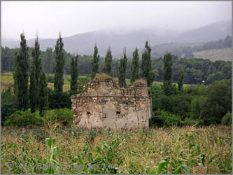 Es folgte aufgrund der schlechten und kurvigen Straßen eine recht lange dauernde Fahrt über die östlichen Ausläufer des Muntii Persani. Über Baraolt (Barot), vorbei an Varghis und Miclosoara, deren beide Schlösser eingezäunt und nicht zugänglich waren, erreichte ich die Kirchenburg von Aita Mare (Aitau) und fuhr von dort aus weiter nach Apata (Geist - schöner Name *g*). Neben der Ortschaft stehen die Ruinenreste einer früheren Wehranlage. Diesmal nicht auf einem Hügel, sondern inmitten eines Maisfeldes - aber mal wieder ohne jeglichen Weg. Es dauerte zwar nur 5 Minuten, bis ich die Mauerecke durch das Feld erreicht hatte, bis dahin hatten sich aber bereits Massen von Schlamm an meinen Füßen gesammelt und meine erst kurz zuvor halbwegs getrocknete Jacke war von den hohen verregneten Maispflanzen mittlerweile ebenfalls wieder klatschnass. Es war offensichtlich nicht mein Tag...