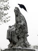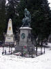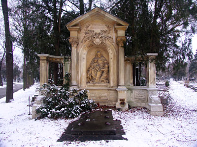 Nach deren Besichtigungen bog ich schräg links ab und folgte einem schier endlosen Pfad zwischen Gräbern, auf denen Krähen ihre Spuren im Schnee hinterlassen hatten. Die dortigen hohen und dichten Bäume schützten mich zudem für kurze Zeit ein wenig vor Wind und Schnee. Mehrfach erblickte ich alte Gräber und vereinzelte Statuen, welche mich wiederholt dazu veranlassten, den ursprünglich gewählten Weg zu verlassen und die Richtung zu wechseln. Nach einer guten Stunde wusste ich nicht mehr wirklich, wo ich nun war. Mit Hilfe eines Plans, den man in jedem Fall bei sich führen sollte, fand ich mich jedoch schnell wieder zurecht und erreichte schließlich das Grab von „Hans Hölzel“, besser bekannt als „Falco“ (zu finden in Gruppe 40).