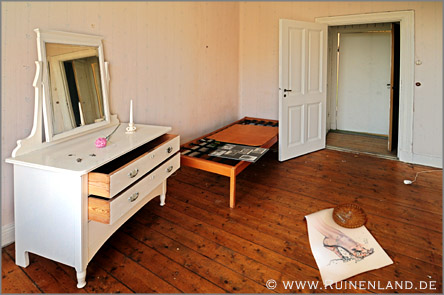 Am frühen Morgen ging es bei Nieselregen an den Stadtrand Göteborgs, unser Ziel war ein verlassenes Haus im Wald. Betonblöcke versperrten uns die Weiterfahrt und so gingen wir das letzte Stück zu Fuß. Auf der Vorderseite waren Fenster und Türen vernagelt, doch Rückseitig stand eines der Fenster offen. Die weitestgehend leeren Innenräume wirkten durch ihre Enge beklemmend. Über dem rostigen Ofen in der Küche hing neben einer vertrockneten Rose eine einsame rote Christbaumkugel, während in einem anderen Zimmer zu einem Ornamentmuster an die Wand geklebte Spiegelbruchstücke Lichtpunkte in den Raum reflektierten.
