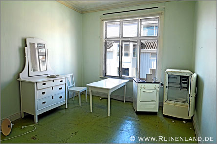 Eine Stunde hatten wir Zeit, woraus letztendlich zwei wurden, wenngleich wir einen halben Tag dort hätten verbringen können. Im Eiltempo hetzte ich schwitzend und nach Luft ringend durch jeden Raum, immer die Uhr im Hinterkopf. Doch ich wollte die Zeit so gut es ging ausnutzen und so viel wie möglich der unzähligen Zimmer im Bild festhalten können. Hier gab es so viel zu sehen und zu entdecken, immer wieder fielen mir neue Dinge ins Auge. Jedes Motiv lichtete ich zur Sicherheit per Stativ gleich mehrfach als Belichtungsreihe mit Über- und Unterbelichtung ab, um im Nachhinein ja von allem auch eine brauchbare Aufnahme im Kasten zu haben. Hinter jeder Tür verbargen sich neue Räume, Gänge und Treppen. Sei es die Küche mit großem Ofen, die Kellerbar mit Restaurant, der Speisesaal mit Blick auf den Hafen, der Tanzsaal mit Klavier oder die unzähligen Zimmer mit ihren alten Möbeln, Betten und Spiegelkommoden. Definitiv ein Highlight dieser Reise.