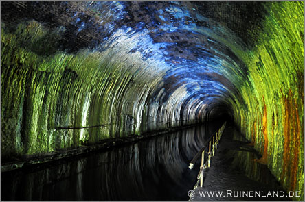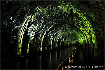 Richtung Heimat war es kein großer Umweg zu einem ehemaligen Bootstunnel an einem Kanal, den ich kurz zuvor im Internet entdeckt hatte. Zwar mussten wir 15 Minuten Fußweg über schlammige Waldwege in Kauf nehmen (ich rutschte bergab natürlich auch prompt aus und versaute mir die ganze Hose...), aber es lohnte sich allemal. Kaum hatten wir das kleine Zugangsportal durchschritten, umgab uns eine Zauberwelt. Mineralablagerungen und unzählige Stalaktiten leuchteten in wechselnden Farben an der gewölbten Decke und den Tunnelwänden, die sich im Wasser spiegelten; Wasser tropfte unaufhörlich von der Decke in den Kanal und erzeugte dabei eine widerhallende Melodie, während durch einen Lüftungsschacht eine Lichtsäule auf die Wasseroberfläche geworfen wurde. Ein überaus faszinierendes Bild! Ich war froh, dass dieser Ort bislang von Graffiti-Sprayern verschont geblieben ist und hoffe, dass dies auch zukünftig so bleibt!