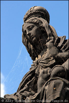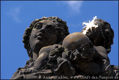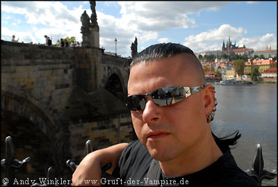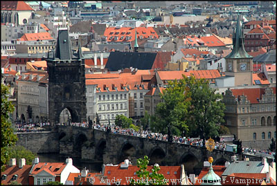 Vom Burgberg lief ich am Flussufer der Moldau (Vltava) entlang bis zur Karlsbrücke, auch hier herrschte hektisches Treiben. Händler boten ihre Waren den Touristen feil, Straßenmusiker spielten auf ihren Instrumenten und Zeichner fertigten Portraits und Karikaturen. Auf beiden Seiten der 520 m langen Brücke standen insgesamt 30 Statuen von Heiligen, deren Gesichter zum Teil von Spinnweben umgeben waren. Es handelt sich hierbei jedoch lediglich um Kopien, die Originale werden aus Schutz vor Umwelteinflüssen im Museum aufbewahrt. Im Jahr 1393 nahm Johannes von Nepomuk, Erzbischof von Prag, der Ehefrau von Kaiser Wenzel (Waclav) IV die Beichte ab. Als sich Nepomuk anschließend weigerte, sein Beichtgeheimnis dem Kaiser zu verraten, befahl dieser, den Erzbischof von der Karlsbrücke in die Moldau und somit in den Märtyrertod zu werfen. Nepomuks Geist wurde daraufhin über 300 Jahre immer wieder am Moldauufer und auf der Brücke gesichtet. Die Statue des hingerichteten Erzbischofs aus dem Jahre 1683 ist gleichzeitig die älteste. Über sie wird erzählt, dass darin Nepomuks Geist gefangen war, bis zu jenem Tag, als die Statue gegen eine Kopie ausgetauscht wurde.