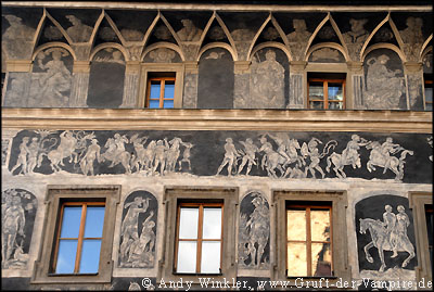 Hinter einer Glasscheibe einer Seitenkapelle des St. Georgs Klosters waren die Gebeine "einer Frau aus dem Konvent" zu sehen, während durch einen Schacht das Licht auf die darüber liegende, kunstvoll bemalte Deckenkuppel fiel. Im Königspalast besichtigte ich u.a. den großen Wladislaw-Saal, die Reiterstiege und die alte Landrechtsstube mit dem Königsthron, bevor ich nach fast drei Stunden die Burg vorbei am Pulverturm wieder verließ.
