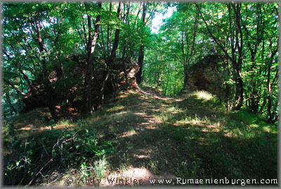 Der Burgberg fiel nach allen sichtbaren Seiten steil ab und so fragte ich am Kiosk, welchen Weg wir gehen müssten. Ein junger Mann führte uns zum Berg und zeigte mit dem Wort "sus" (oben / hoch) auf einen mit Dornen verwachsenen Pfad, der steil nach oben führte. Ungläubig fragte ich noch zweimal nach, ob dies tatsächlich der einzige Weg sei - und scheinbar war er das. Um es gleich vorweg zu nehmen: Auch Zebernicului gehört wohl zu jenen Burgen, die mich vermutlich kein zweites Mal sehen werden!