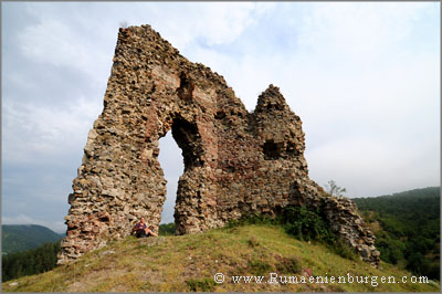Gut gestärkt brachen Birgit und ich schließlich nach Mehadia (Mihald) auf, um die dortige Burgruine zu besuchen. Die Burg bestand einst aus einem im 13. Jahrhundert erbauten, sechseckigen Turm sowie aus einem Rundturm späteren Datums. Beide Türme waren mit zwei 65 m langen, parallel verlaufenden Mauern verbunden. Heute stehen auf dem Berg nur noch die Ruinen des ersten, einst dreistöckigen und rund 20 m hohen Turmes. Nach immer wiederkehrenden, jahrzehntelangen Belagerungen und Eroberungen durch die Türken, wurde die Burg im 4. türkisch-österreichischen Krieg zwischen 1788 und 1791 endgültig zerstört.