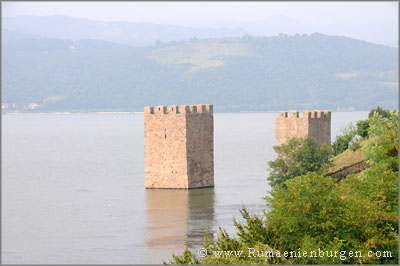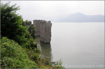 Die Straße Richtung Moldova Noua (dt. Neumoldowa) war streckenweise in einem immens schlechten Zustand, aber es wurde überall gebaut, so dass hier zumindest zukünftig Besserung in Sicht ist. Nahe Svinita legten wir einen weiteren Fotostopp an der Cetatea Tri Cule ein. Eigentlich sind es drei Türme, von denen aber nur noch zwei - aufgrund der Stauung der Donau heute im Wasser stehend - erhalten sind. Vom dritten Turm, der 1910 noch intakt war, existieren nur noch Fundamente. Erbaut im 16. Jahrhundert, war die Burg später Bestandteil einer Habsburger Zollstation, die hier nach dem Friedensschluss von 1792 errichtet wurde.