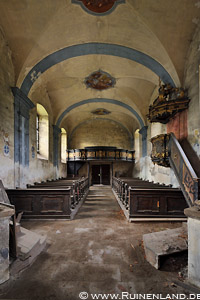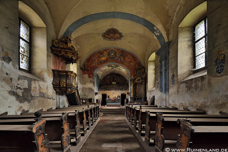 Glücklicherweise war die Tür nicht verschlossen, sodass wir das Gebäude zum Fotografieren ungehindert betreten konnten. Im Inneren existierten mit Altar, Kanzel, Empore, den Kirchenbänken und mehreren Fresken noch vielerlei interessante Dinge. Da für heute keine weitere Besichtigung angedacht war, ließ ich mir ausreichend Zeit, um alles zu fotografieren, als ich bemerkte, dass jemand durch den Spalt der Eingangstür schaute. So ging ich hin, öffnete die Tür und blickte in die erschrockenen Augen eines "alternativ gekleideten", jungen Mannes, den ich freundlich begrüßte. Nachdem er sah, dass wir lediglich Hobbyfotografen waren, traute er sich hinein und erzählte mir zu meiner Verwunderung schließlich, dass er im Ort leben würde, häufig entlang der Kirche spazieren ginge und sich immer gefragt hätte, wie sie im Inneren wohl aussehen möge. Ich fragte mich in Gedanken im Gegenzug, warum er dann nie auf die Idee kam, einfach mal die unverschlossene Tür zu öffnen, um einen Blick hinein zu werfen...? Aber sei's drum; nach einer Weile verabschiedeten wir uns, machten noch ein paar Außenaufnahmen und fuhren weiter.