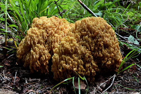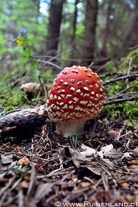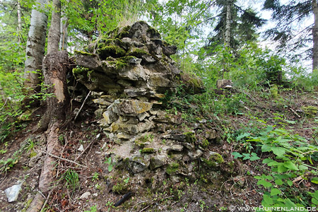 Also gingen wir über ein Wiesenplateau zum Nachbarberg. Als erstes stießen wir im Wald oberhalb einer Felskante auf einen offenbar alten, halbrunden Wall mit aufgeschichteten Steinen. Ob es sich dabei möglicherweise um ein Vorwerk der Cetatea Ciceu handelte (das auf deren Grundriss nicht eingezeichnet ist) oder diese Stelle einst eventuell als Steinbruch zum Bau der eigentlichen Burg genutzt wurde, kann ich nicht sagen. Vorbei an Fliegenpilzen, Schwammpilzen, bemoosten Ästen voll Spinnweben, Sträuchern mit roten Beeren und Bärenkot erreichten wir nach weiteren ca. 150 m den Burgfelsen. Und diesmal waren wir definitiv richtig, wie uns Mauerreste auf der Nordwestseite und Bearbeitungsspuren im Fels zeigten.