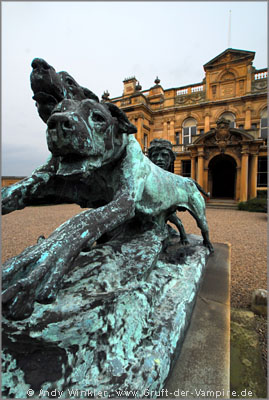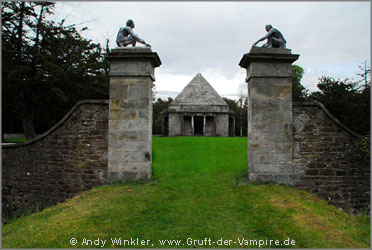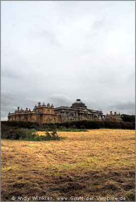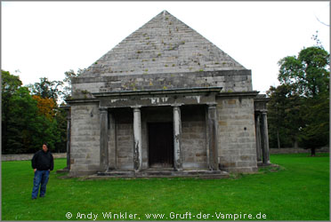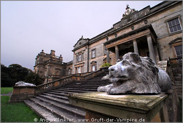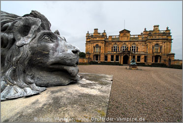 Im kleinen Shop unweit des Castles kaufte ich mir noch ein Buch über schottische Burgen, bevor wir mit dem Bus zurück nach North Berwick fuhren. Nach einem kurzen Stopp an der dortigen Kirchenruine ging es per Zug weiter nach Longniddry, von wo aus wir mit dem Bus Richtung Aberlady bis zum Gosford House fuhren. Auf dem riesigen Anwesen, deren Seitenflügel nach Einsturz Ende des 19. Jahrhunderts wieder aufgebaut wurden, wurden unter anderem die Außenaufnahmen vor der McAshton-Gruft im Kinofilm vom kleinen Vampir gedreht, ebenso Innenaufnahmen im Treppenhaus.