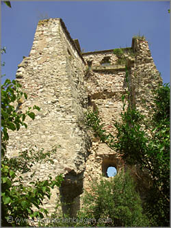 Das letzte Stück des Weges führte auf einem steilen, von Dornenbüschen verwachsenen Pfad zur Burg hinauf. Miri, Birgit & Attila entschieden sich schließlich dazu, nicht bis ganz nach oben zu gehen. Ich hielt mir stattdessen schützend meine Jacke vors Gesicht und umrundete so auch die Ruine, auf dessen Rückseite noch Fenster- und Toröffnungen erkennbar waren.